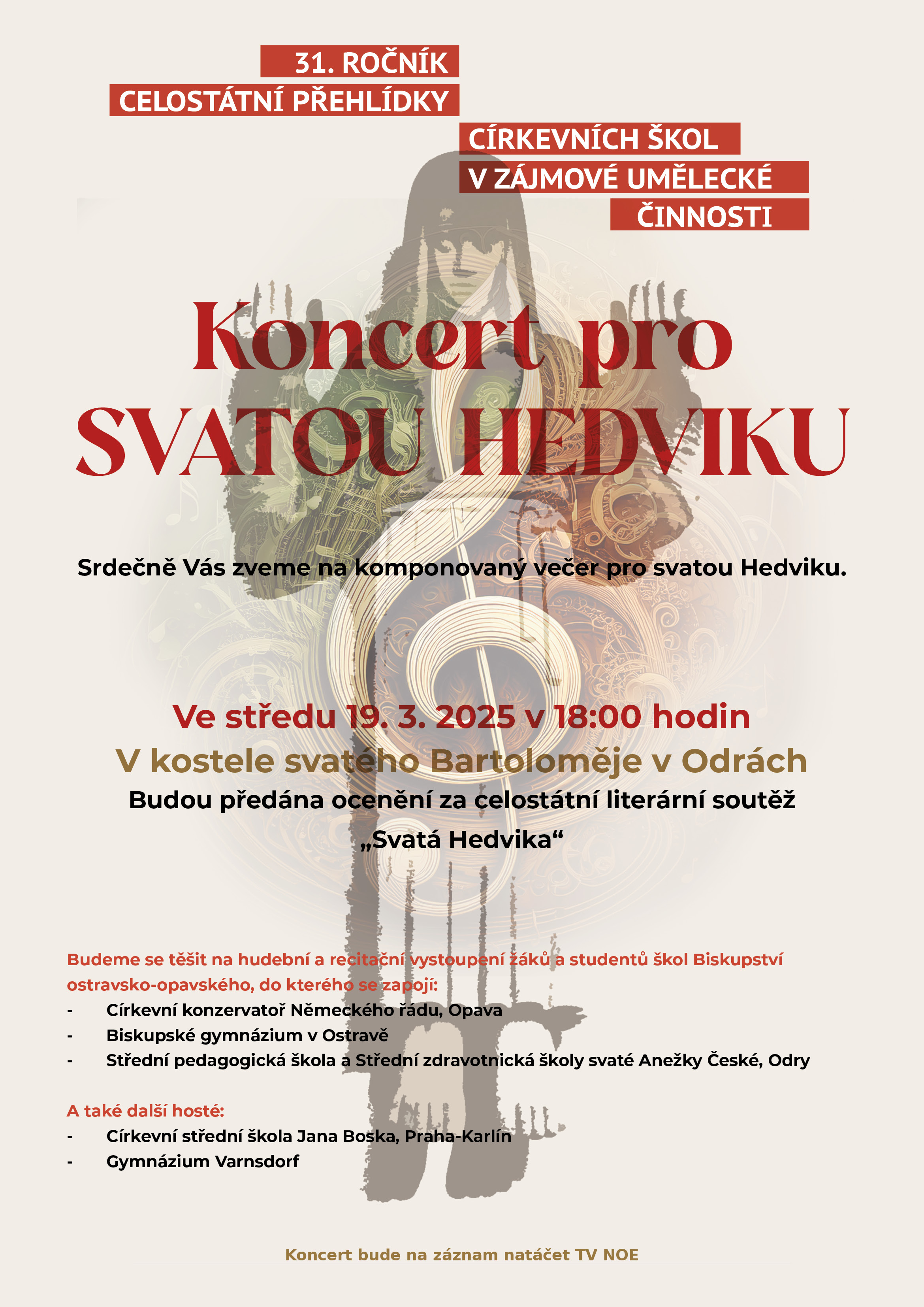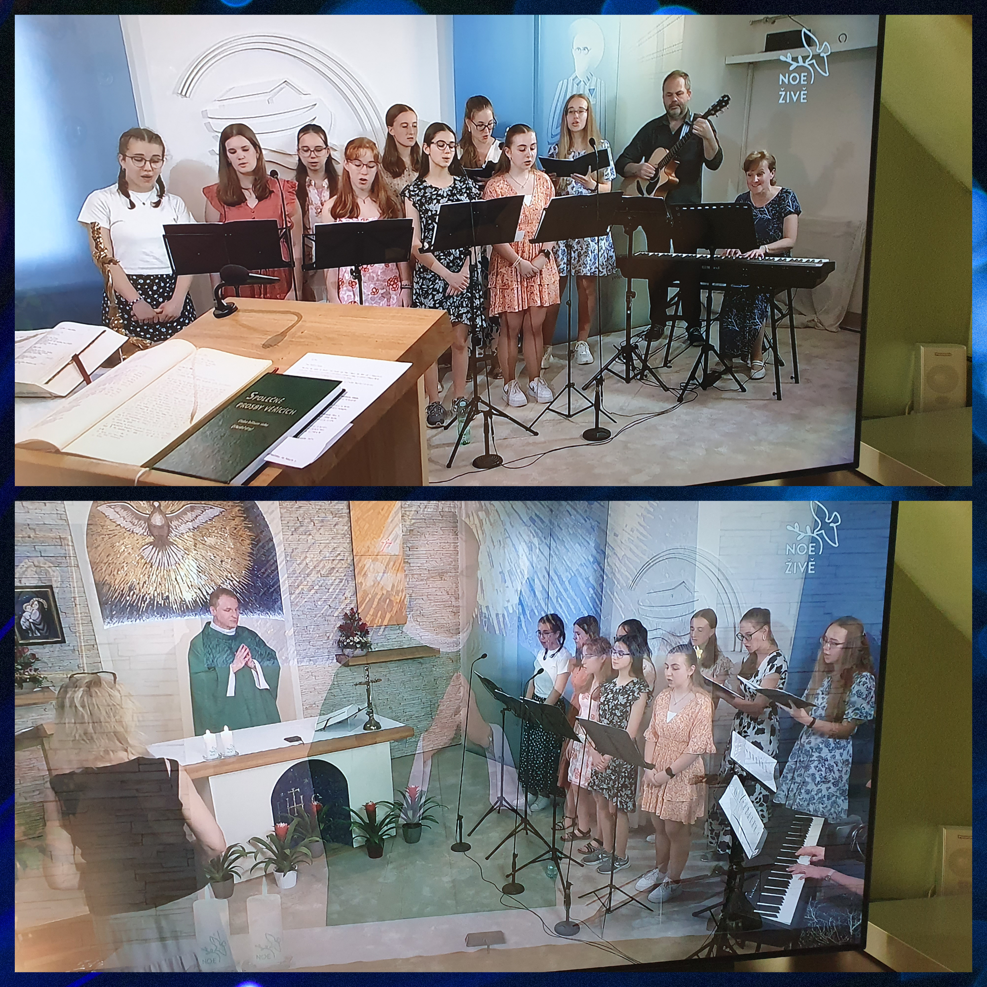 Naše schola měla tu čest doprovodit mši svatou v přímém přenosu televize Noe. Byla to pro nás krásná a nezapomenutelná událost – nejen proto, že jsme mohli zazpívat v opravdovém televizním studiu, ale také proto, že mši sloužil náš milý školní kaplan, otec Jan.