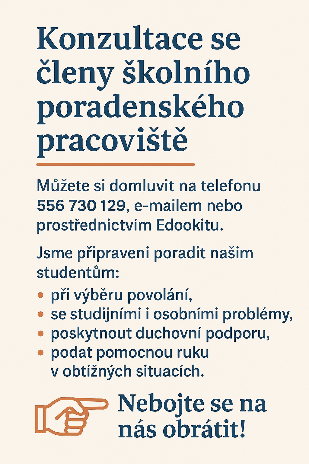 Naše školní poradenské pracoviště je připraveno pomoci všem studentům, kteří se potýkají se studijními či osobními obtížemi.