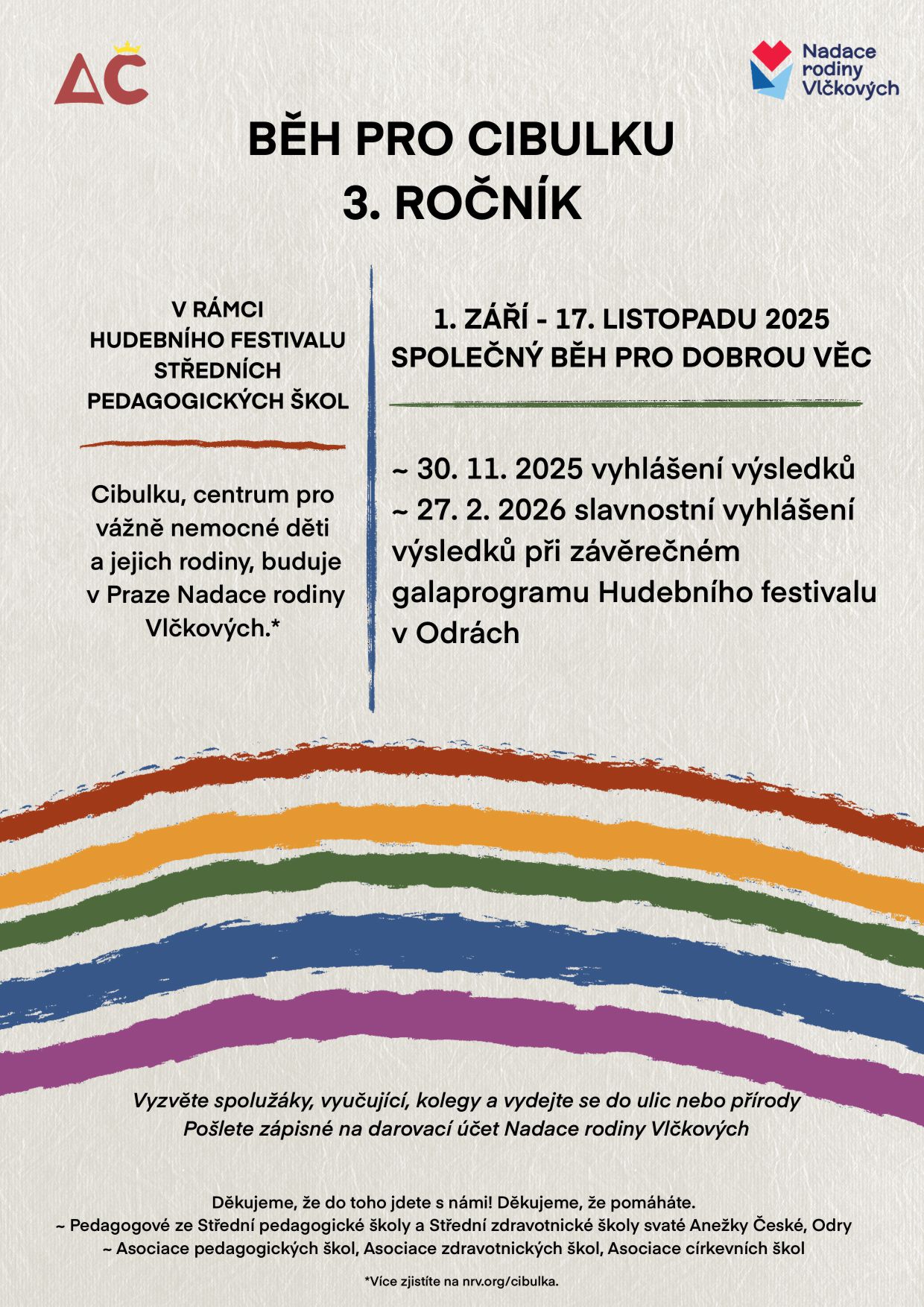 Ve středu 24. září se v parku pod Střední školou svaté Anežky České uskutečnil charitativní běh pro nadaci rodiny Vlčkových – Běh pro Cibulku. Celá akce se nesla v duchu barev, radosti a vzájemné podpory.