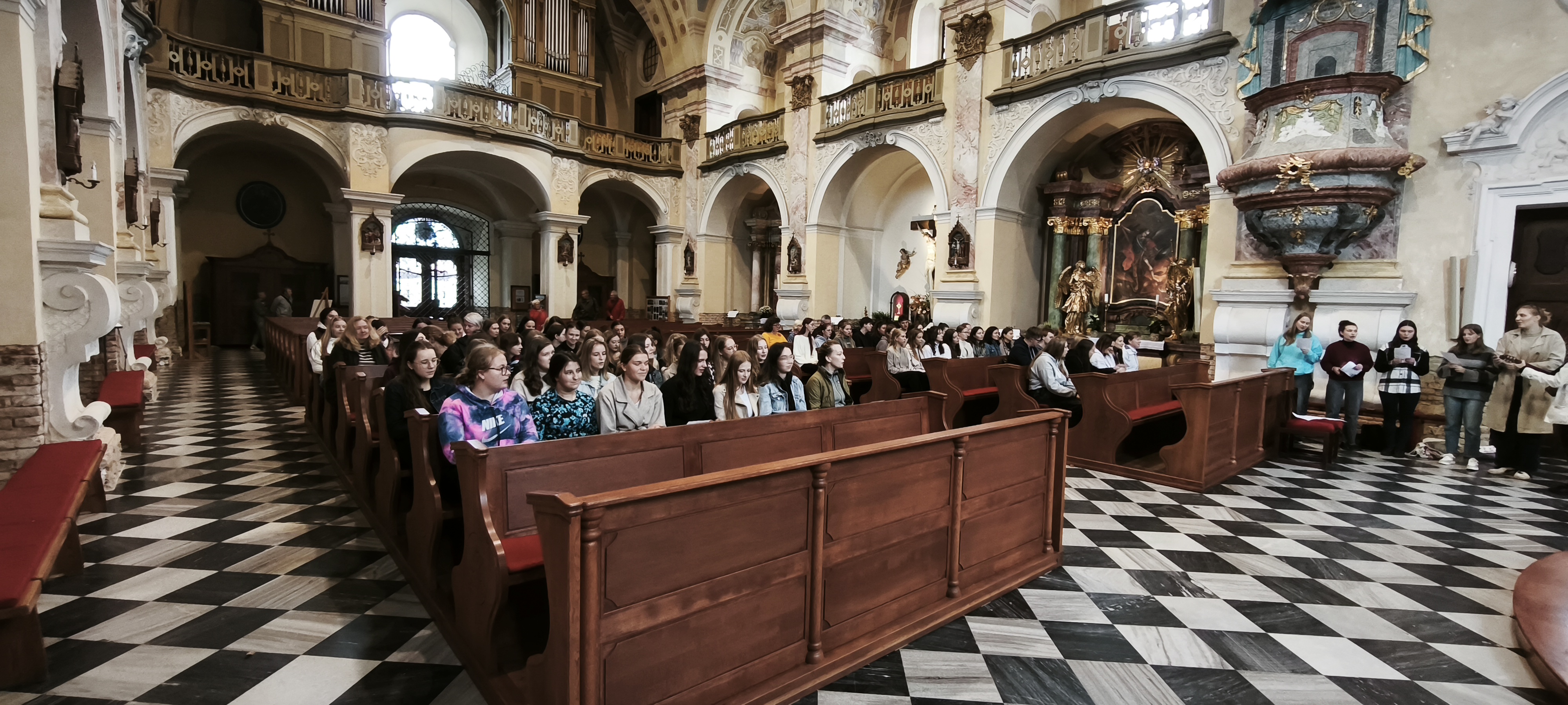 V úterý 16. září se končící ročníky vydaly autobusem na poutní místo Cvilín. Tamní kostel zasvěcený Panně Marii Sedmibolestné je jedním z jubilejních kostelů v naší ostravsko-opavské diecézi. Přijeli jsme tam v den sv. Ludmily prosit především za Boží požehnání do následujících týdnů a měsíců, kdy naše maturanty a ošetřovatele čekají důležité zkoušky. Na místě proběhla mše svatá s našim kaplanem P. Janem Slepičkou a prohlídka poutního místa s průvodcem.