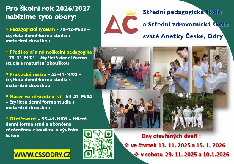 Srdečně zveme na DEN OTEVŘENÝCH DVEŘÍ, který se bude konat ve čtvrtek 9. listopadu, od 10:00 - do 17:00. Den otevřených dveří zahájíme malým vystoupením našeho sboru Datio a v 10:00 hodin představením školních přijímacích zkoušek zdatností pro obor Předškolní a mimoškolní pedagogika. Návštěvníci uvidí představení zkoušek z HV, TV, mluvních dovedností a uvidí ukázky výtvarných prací pro zkoušku z VV. Přijimací zkoušky "nanečisto" si uchazeči budou moci u našich vyučujících HV a ČJ také vyzkouš...